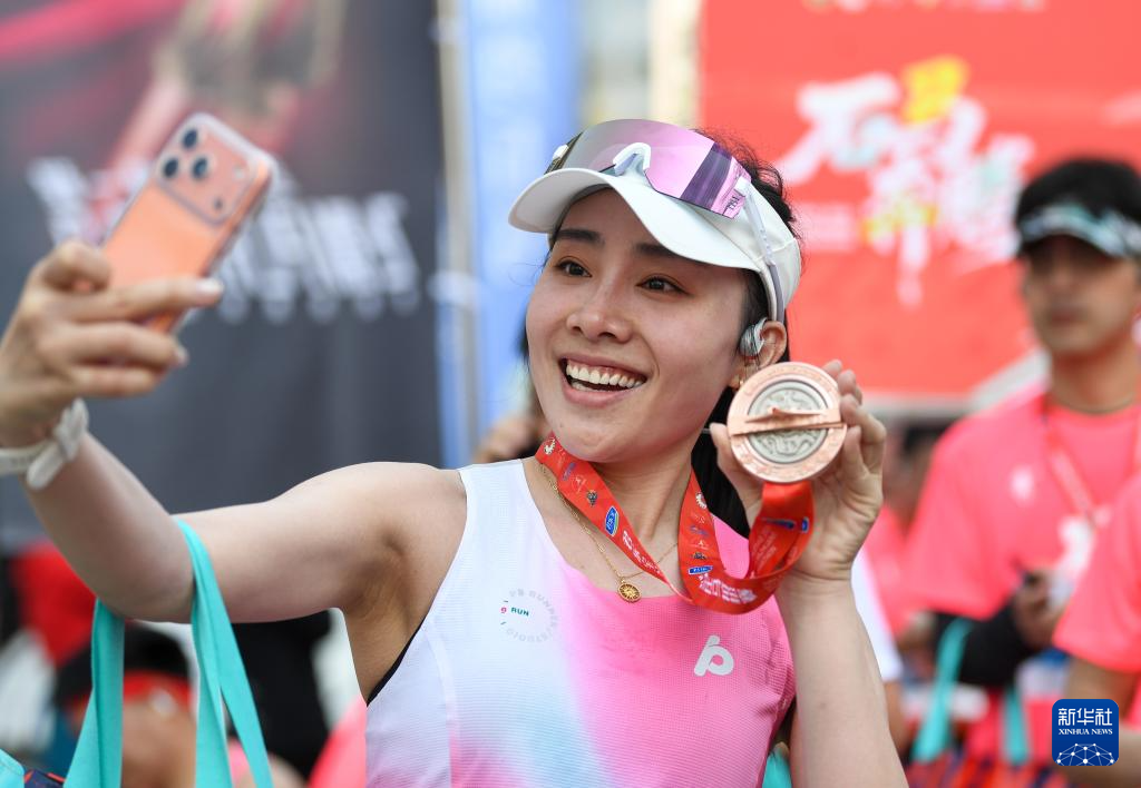 3月29日,一名参赛选手赛后手持完赛奖牌自拍留念。