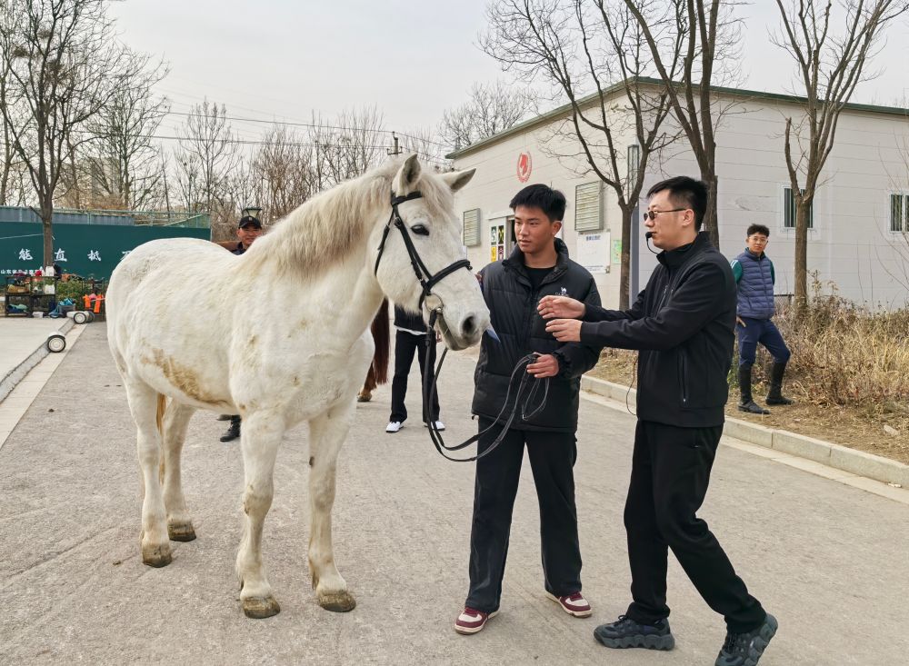 山东体育学院马术教研室主任许志亮站在马的一侧,一只手轻轻抚摸马颈,另一只手捏着一条缰绳。“不同品种的马匹性情各异,接近它们前需进行充分交流,并留意耳朵朝向、尾巴摆动和眼神状态,这些都是马匹情绪的外在信号。”