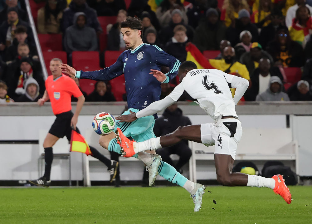 3月30日,德国队球员哈弗茨(左)和加纳队球员阿杰蒂在比赛中拼抢。新华社发(菲利普·鲁伊兹摄)