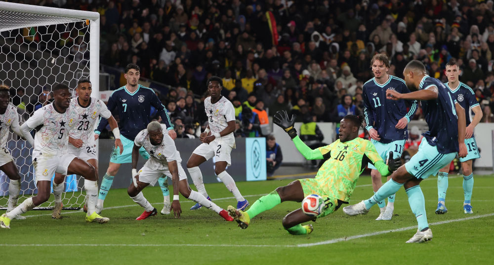 3月30日,加纳队门将阿萨雷(中)在比赛中扑救。新华社发(菲利普·鲁伊兹摄)