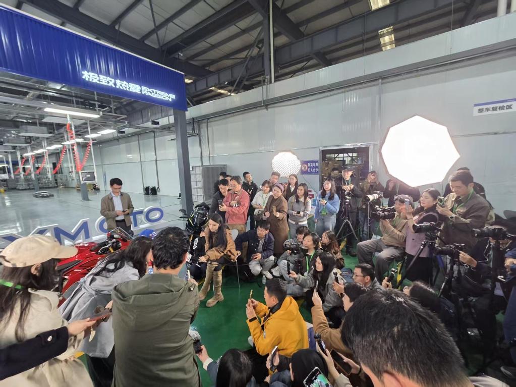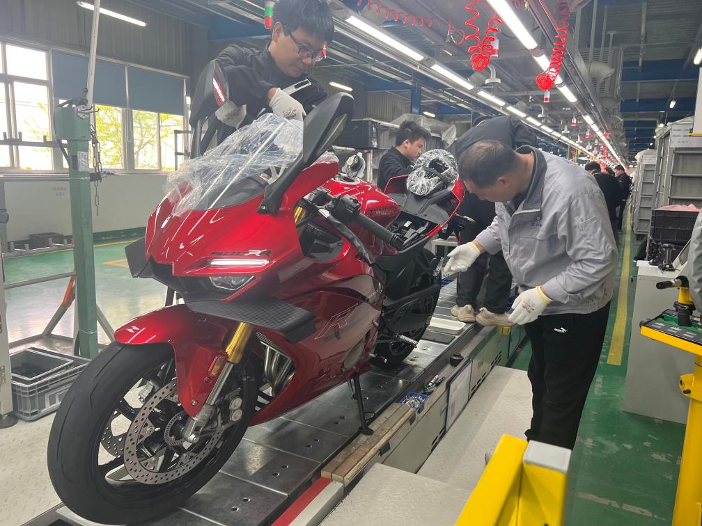 4月1日,在重庆张雪机车生产车间,工作人员对下线整车进行出库前检查。新华社记者 周文冲 摄