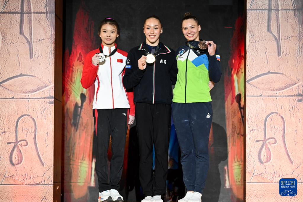 4月5日,冠军阿尔及利亚选手奈穆尔(中)、亚军中国选手蒋淑婷(左)、季军斯洛文尼亚选手赫里巴尔在颁奖仪式上。