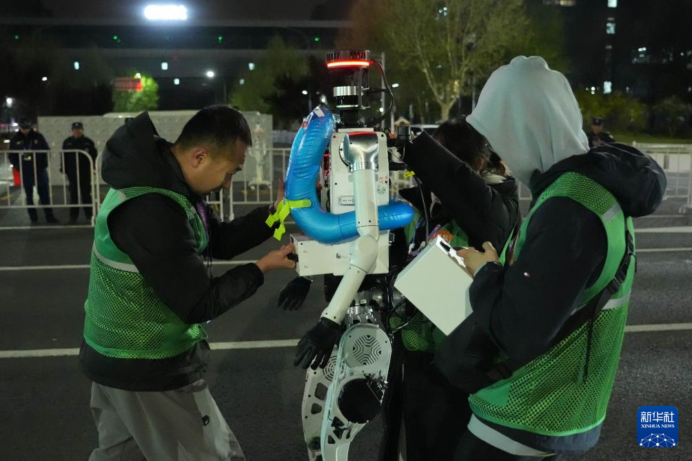 4月12日凌晨,操作人员在调试一台参加全要素测试的机器人。