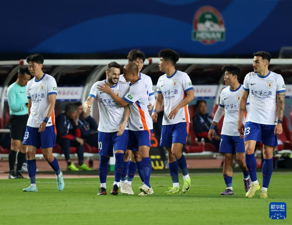 4月11日,山东泰山队球员在比赛中庆祝进球。