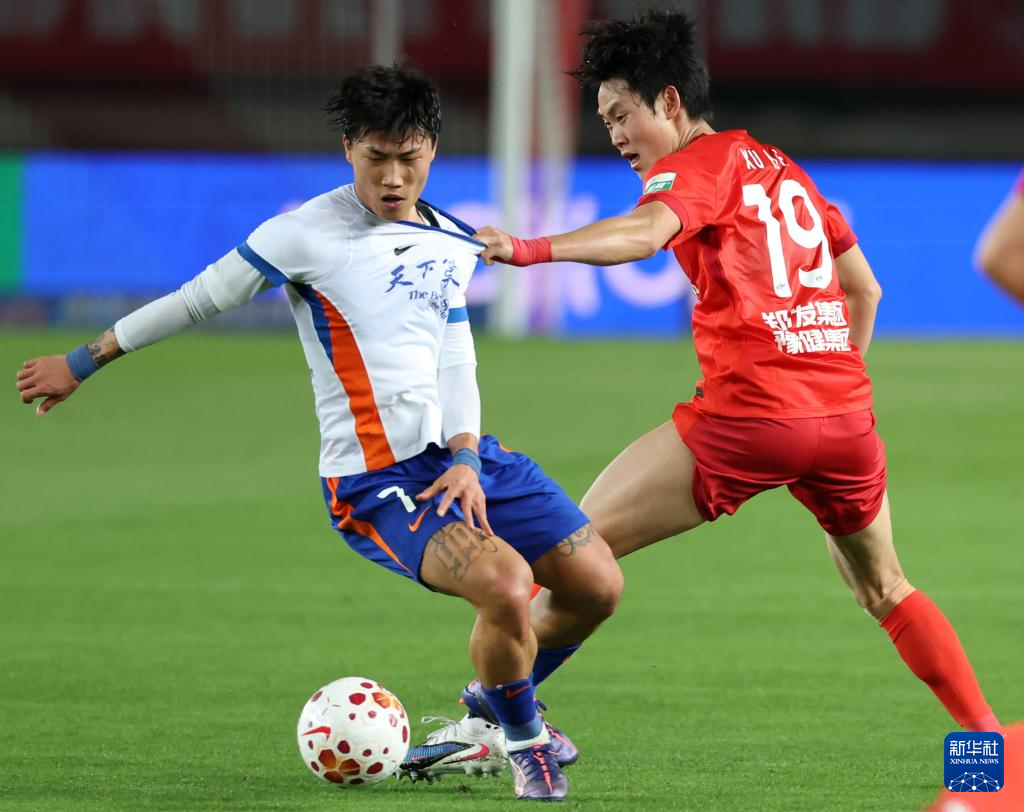 4月11日,山东泰山队球员谢文能(左)与河南俱乐部彩陶坊队球员徐浩峰在比赛中拼抢。