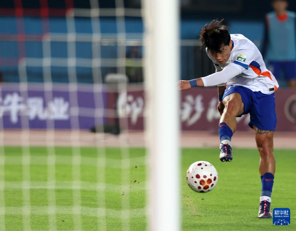 4月11日,山东泰山队球员谢文能在比赛中射门。