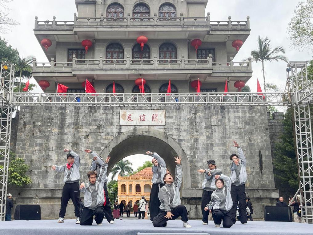 2025年3月30日,在广西凭祥友谊关,越南舞者在表演街舞。