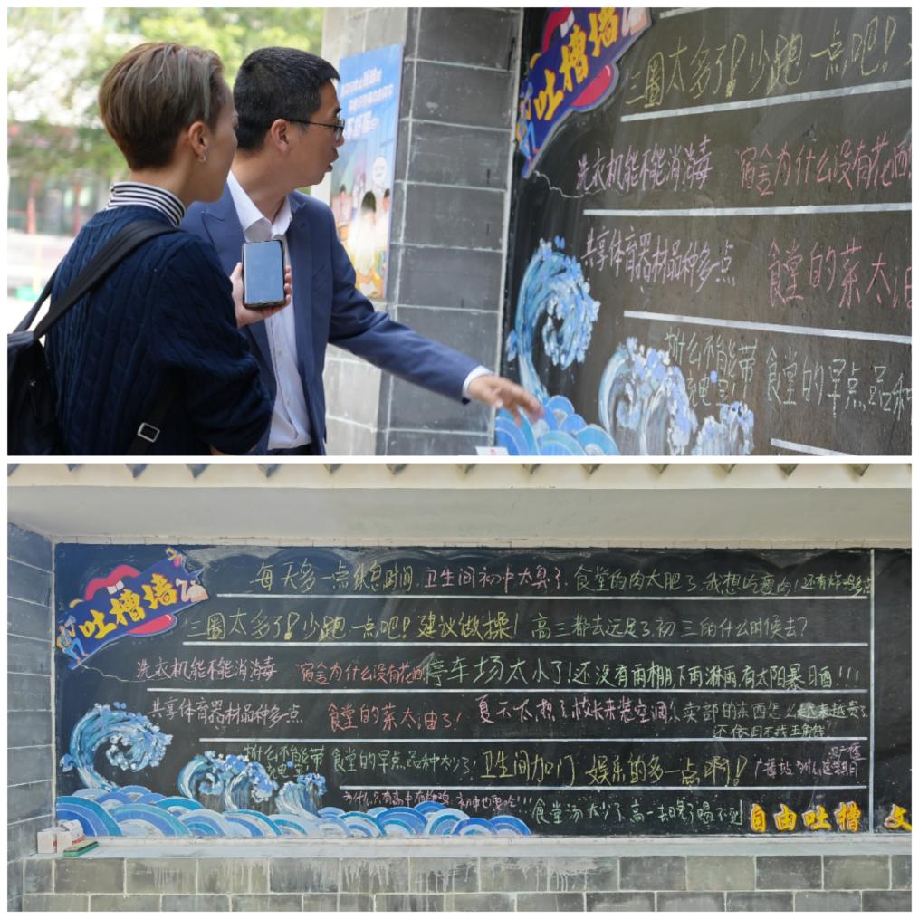 为了培养学生的主人翁意识,张敏想了不少招。他曾设置“校长信箱”,但发现“太过正式”。后来,他改为“张老师悄悄话信箱”,用语亲切了,也有同学来信,但写信的还是少数,直到去年2月,张敏忽然想通了——干脆弄一面墙,让每个同学都能吐槽。