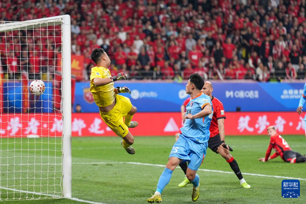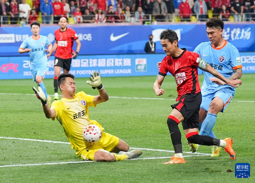 4月21日,云南玉昆队守门员鲍亚雄(左)在比赛中扑救失败。