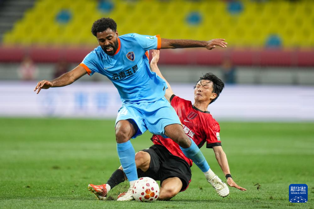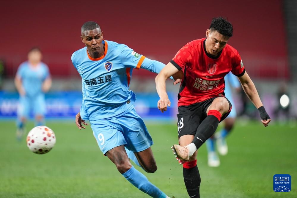 4月21日,成都蓉城队球员韩鹏飞(右)和云南玉昆队球员克莱伯在比赛中拼抢。