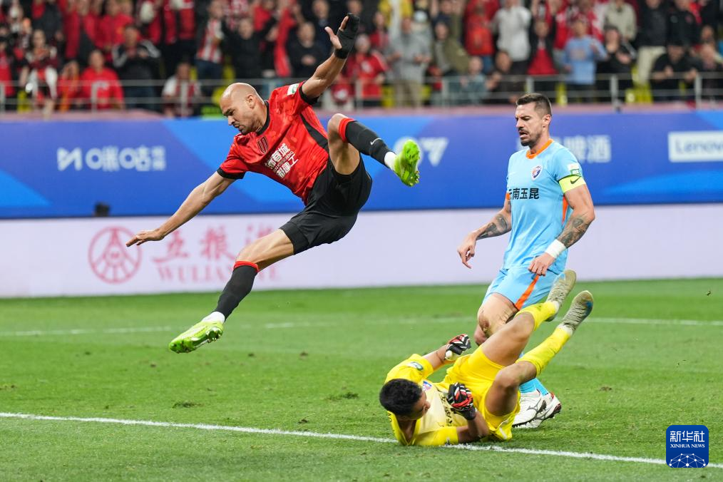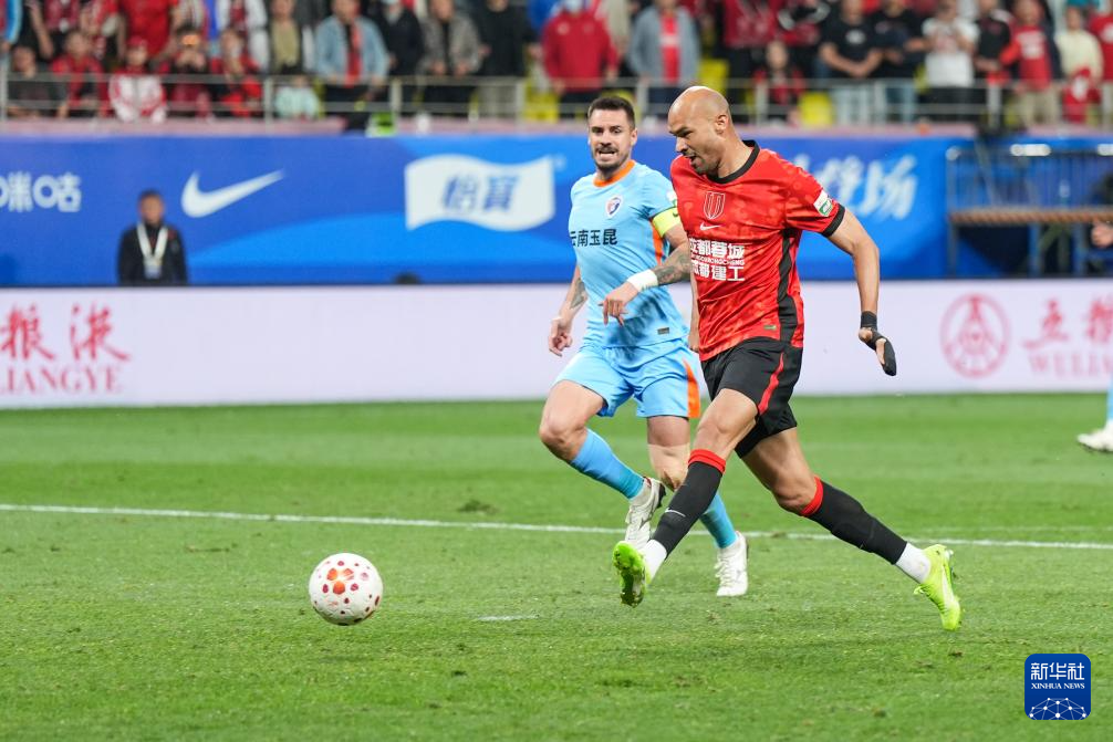 4月21日,成都蓉城队球员费利佩(上)在比赛中射门得分。