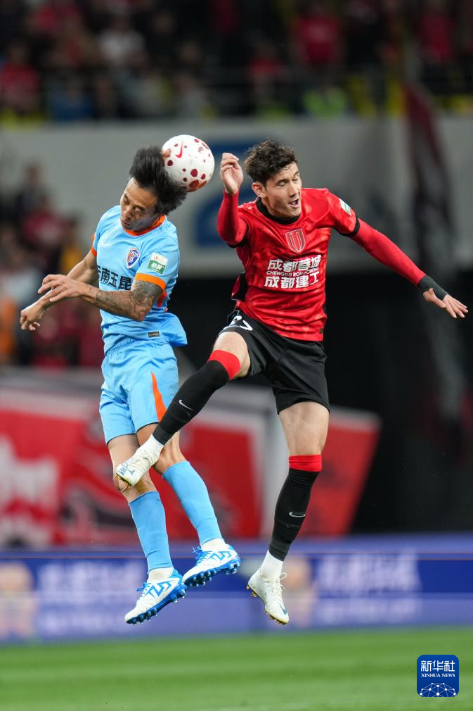 4月21日,成都蓉城队球员拜合拉木·阿卜杜外力(右)和云南玉昆队球员叶楚贵在比赛中争顶。