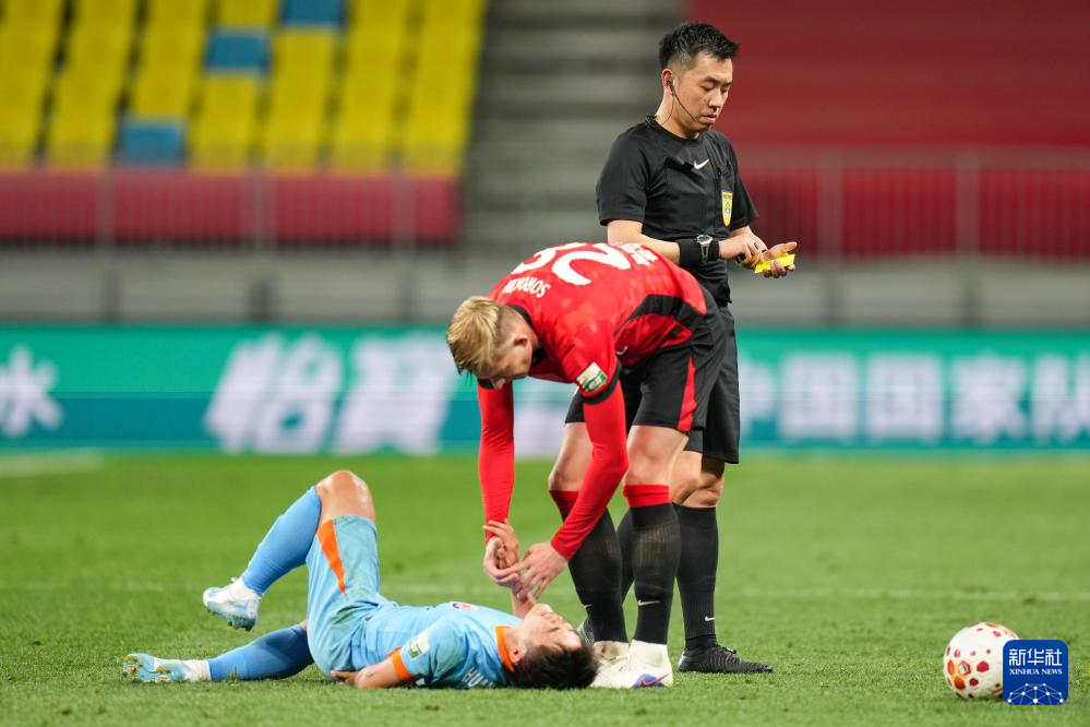 4月21日,主裁判戴弋戈(右)向成都蓉城队球员索罗金(中)出示黄牌。