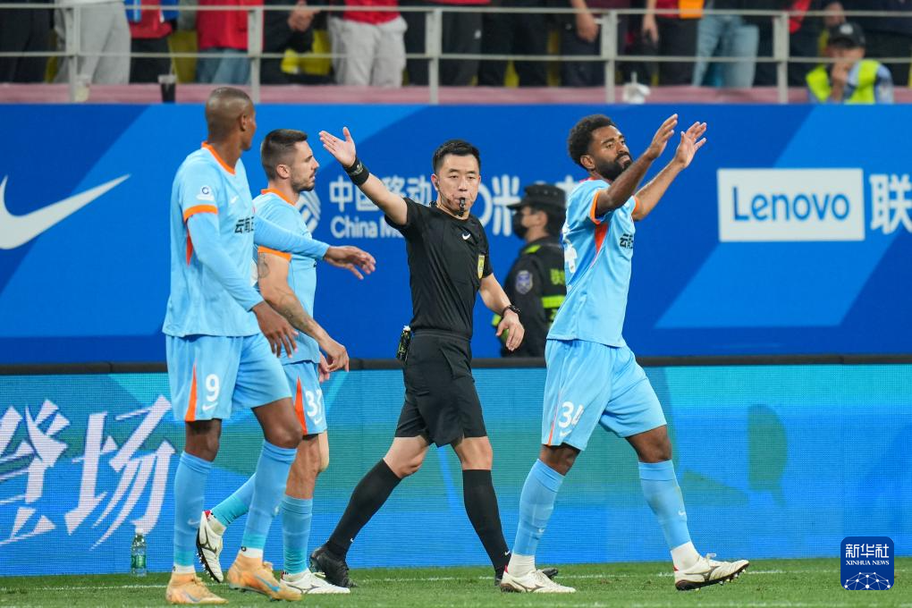 4月21日,主裁判戴弋戈(右二)在回看VAR(视频助理裁判)后判罚云南玉昆队进球无效。