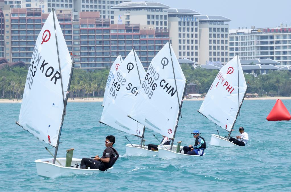 4月23日,中国选手许祐嘉(右二)在亚沙会OP帆船男子第1轮比赛中。新华社记者 张帆 摄