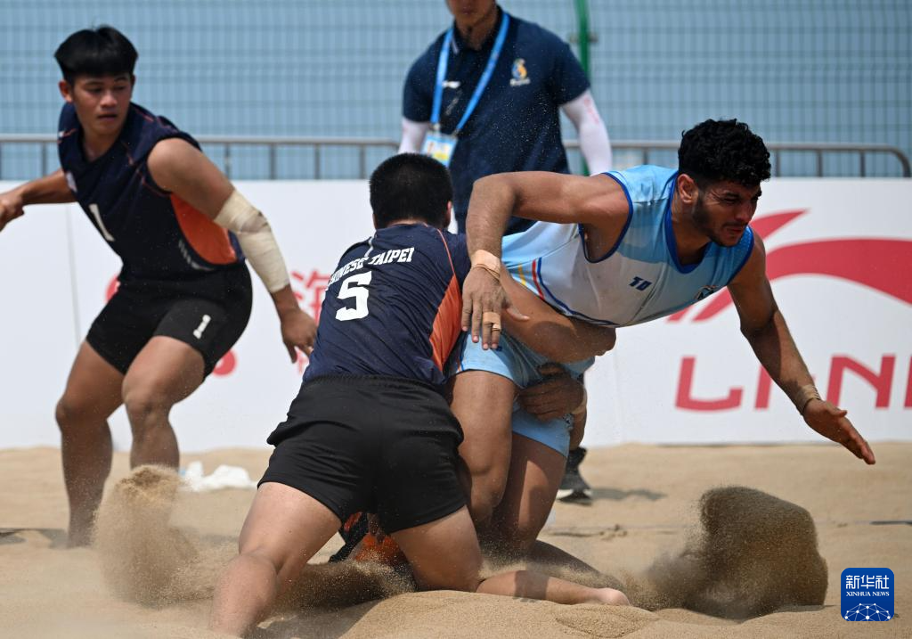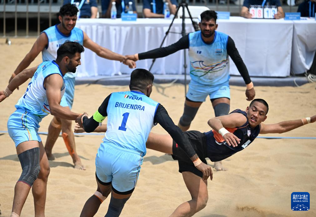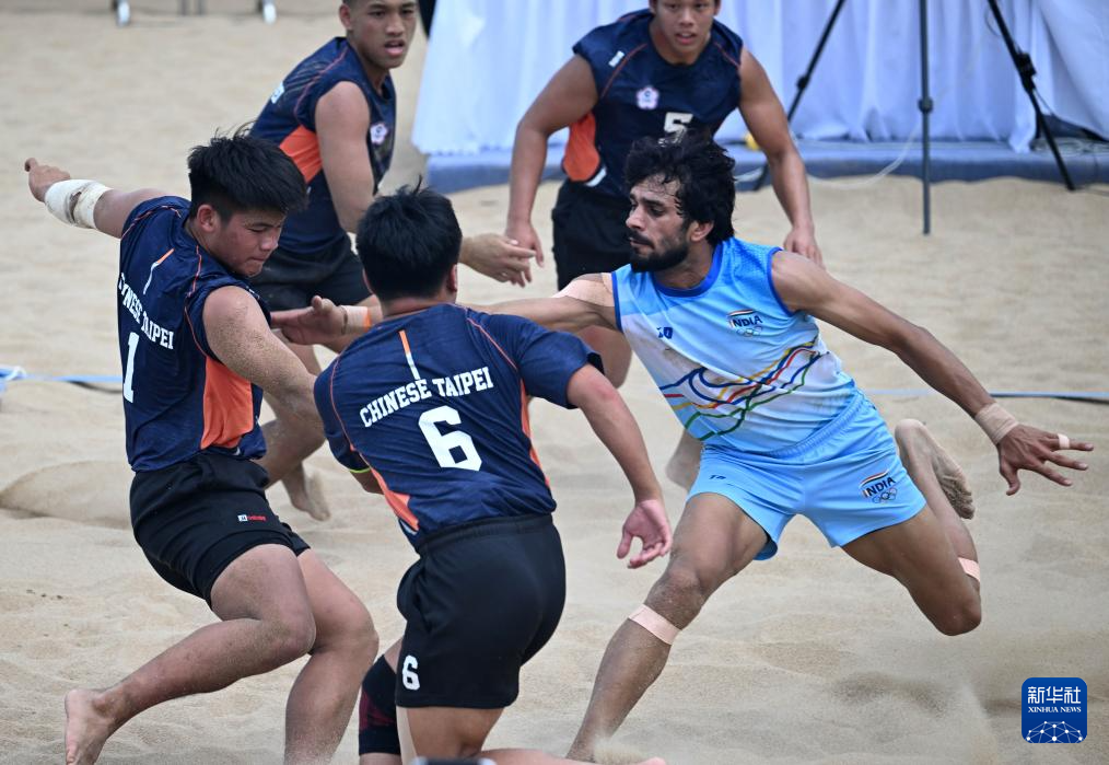 4月23日,在海南三亚举行的第六届亚洲沙滩运动会沙滩卡巴迪男子小组赛中,印度队66比23战胜中国台北队。