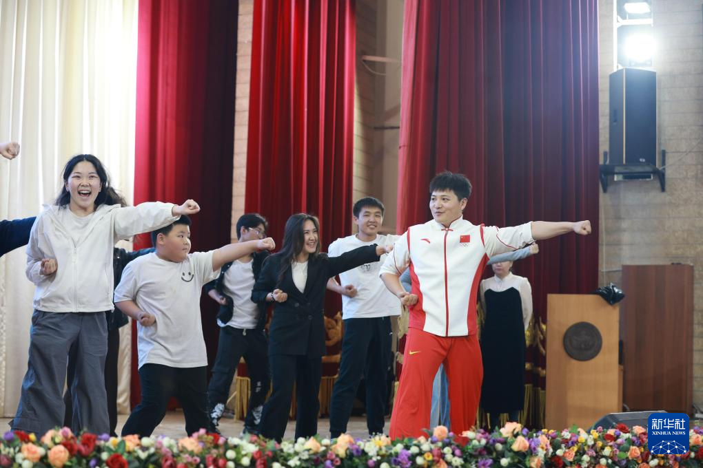 4月23日,在吉尔吉斯斯坦比什凯克,武术世界冠军史龙龙(前右一)在“华夏风·功夫行”2026年“国际中文日”武术巡演活动中教观众武术动作。