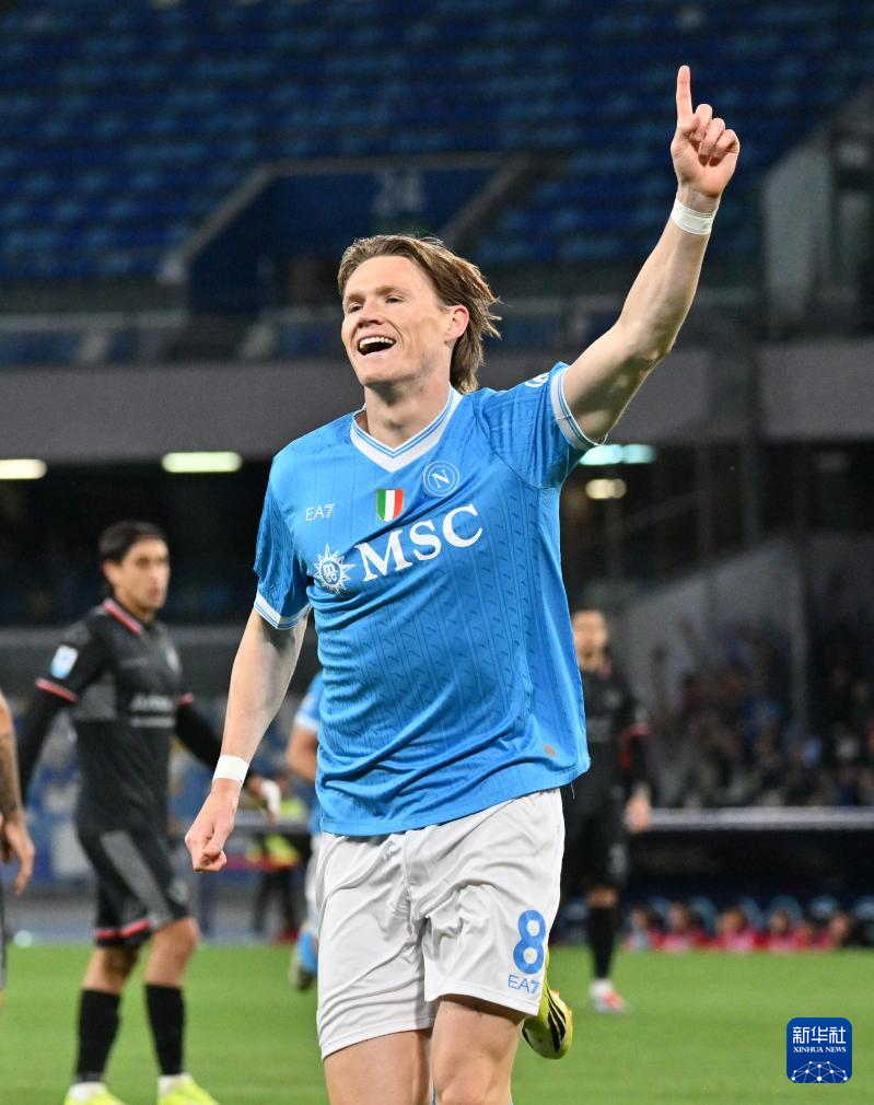 4月24日,那不勒斯队球员麦克托米奈在比赛中庆祝进球。
