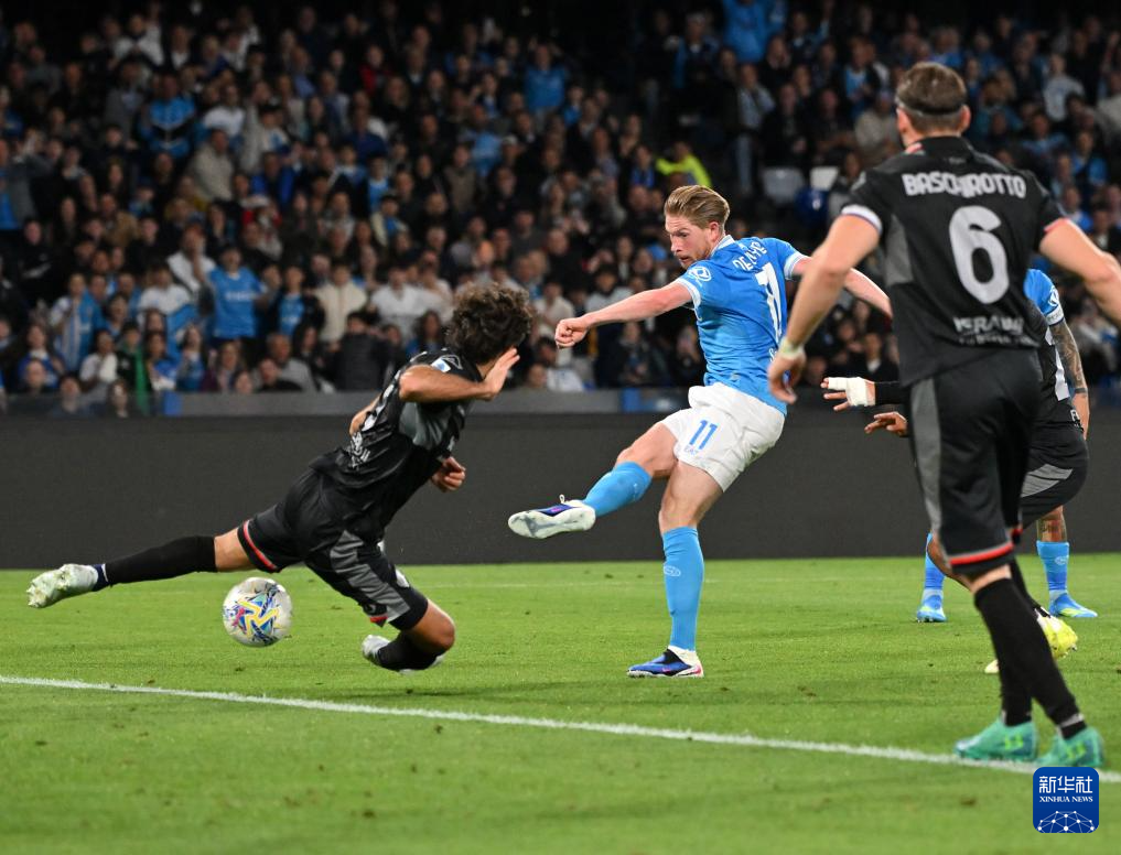 4月24日,那不勒斯队球员德布劳内(左二)在比赛中射门得分。