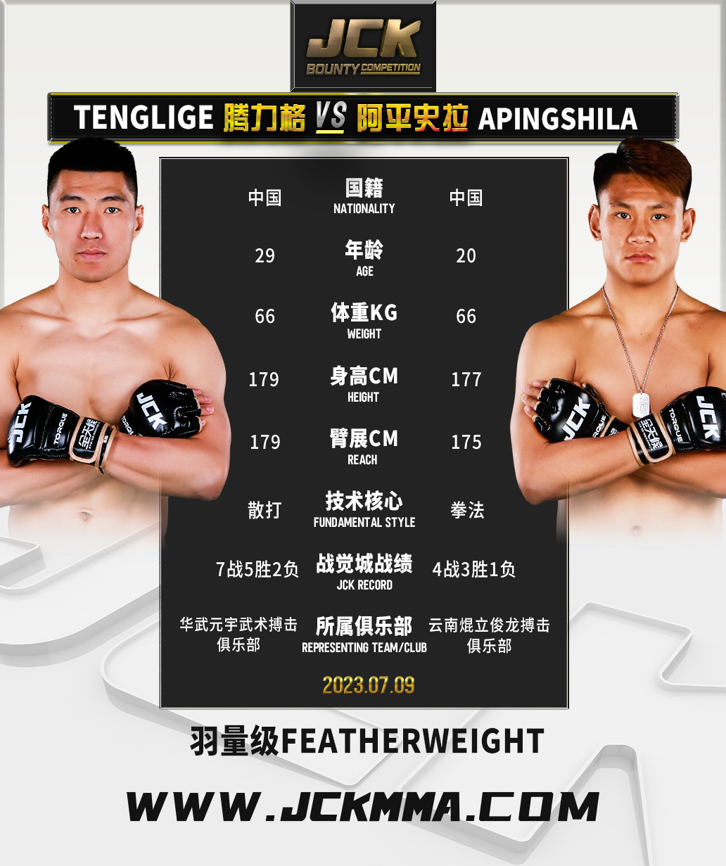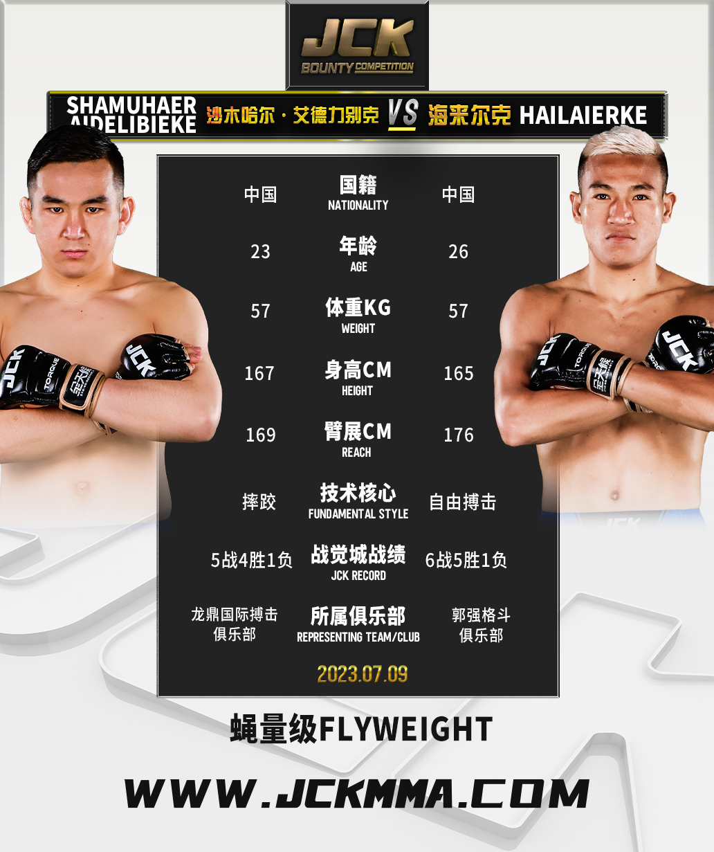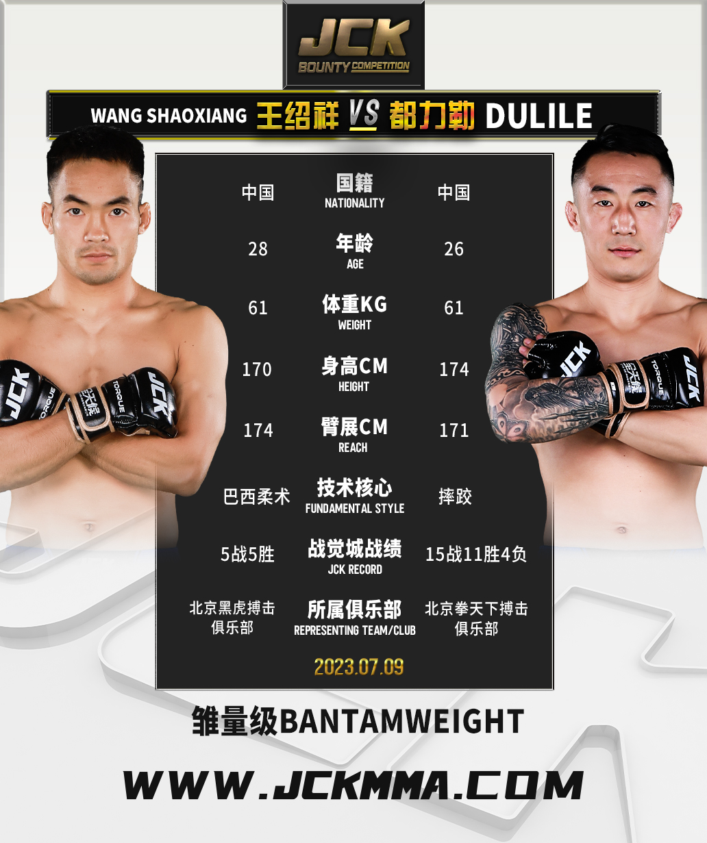 2023年7月9日,JCK战觉城2022-2023赛季第29战“觉城之巅”即JCK战觉城笼斗赏金挑战赛决赛来袭,头条主赛尚志法与布火有呷两强相争,联合主赛王绍祥与都力勒、王纪征与胡布兰·吐尔逊别克争夺百万;王奇与丁猛、艾力·木拉特别克与来自塔吉克斯坦的阿吉两组赏金赛半决赛也将在本场决出胜负。