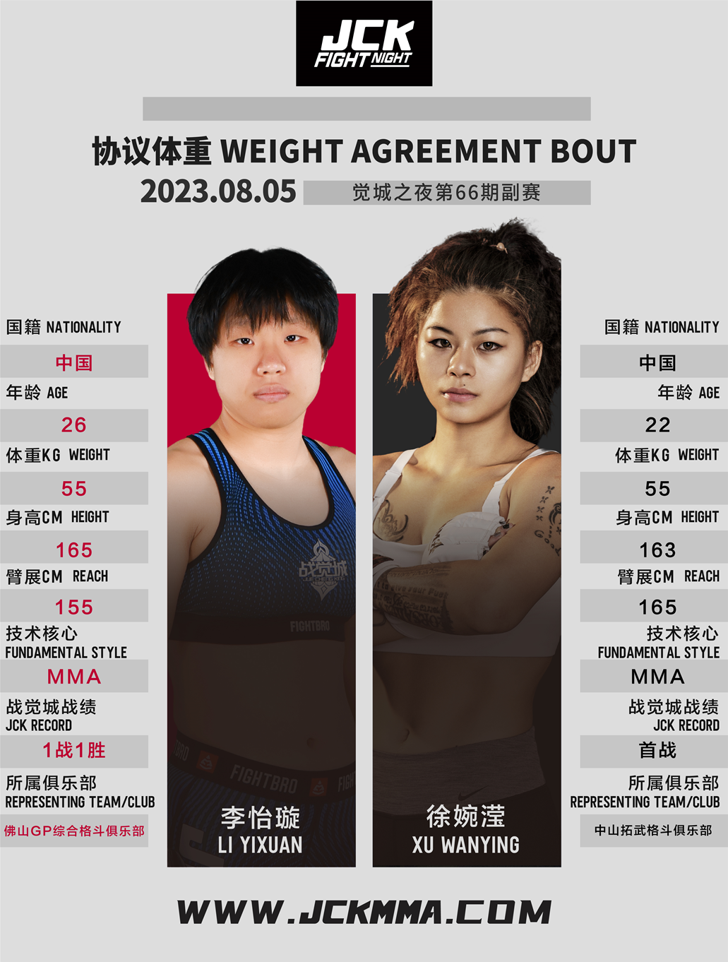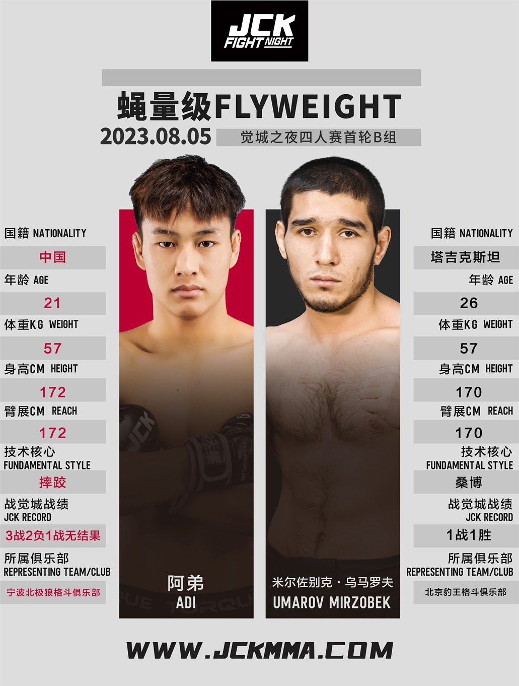 2023年8月5日,JCK觉城之夜 N66“初露锋芒”即将打响,阿伊丁·托合塔尔别克与石晓东领衔头条主赛,萨迪尔·图尔迪阿吉与拉赫米丁·贝科夫出战联合主赛,还有两场主赛阵容,分别为吉木五沙VS文允斌、杨飞VS白国庆。四人锦标赛首轮争夺阵容为布火古补VS向光伟、 阿弟VS米尔佐别克·乌马罗夫,除此以外还有1场女子副赛。