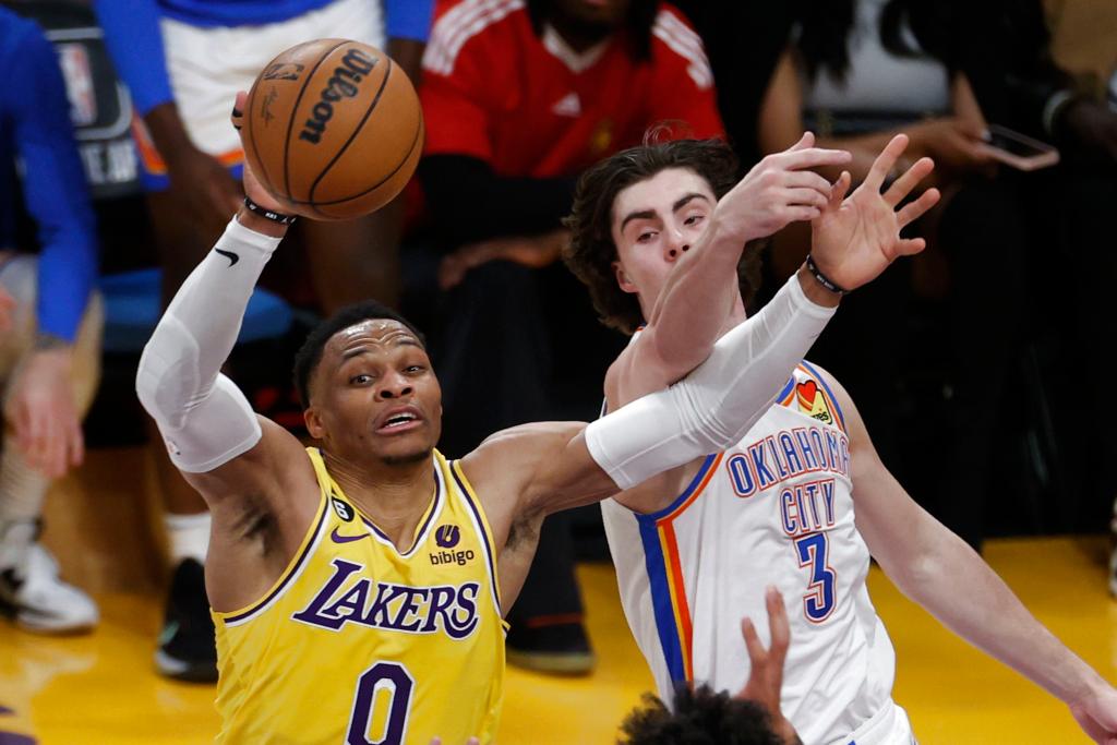 2023年2月7日,湖人队球员拉塞尔·威斯布鲁克(左)与雷霆队球员约什·吉迪在比赛中拼抢。新华社发(赵汉荣摄)