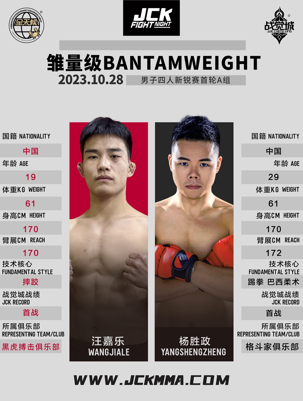 汪嘉乐,年龄19岁,职业战绩:3战2胜,首战JCK战觉城。来自黑虎搏击俱乐部。