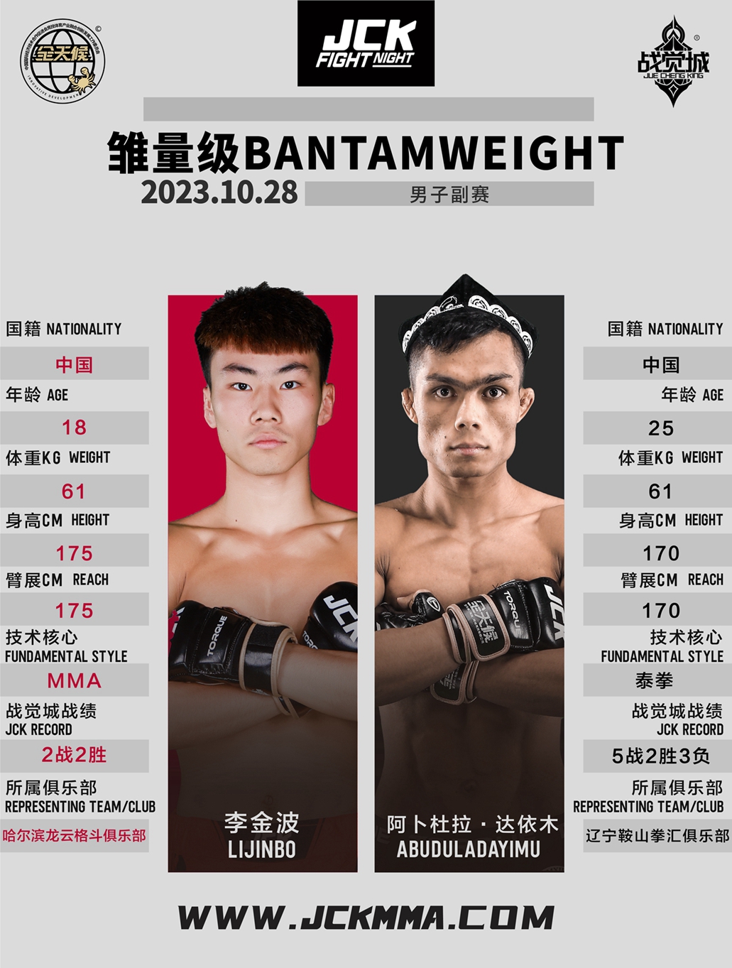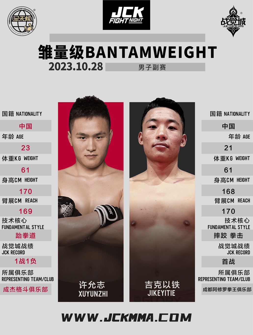 2023年10月28日,JCK觉城之夜N72“破晓时分”即将打响,头条主赛库尔班江·吐罗斯巴克VS丁猛三番战争夺次中量级百万赏金;联合主赛郑伯切VS蔡雄雄争夺蝇量级金腰带挑战权;正赛部分彭爽对战勿雷衣付;四人新锐赛首轮阵容汪嘉乐VS杨胜政、拉拜VS依火阿各,两场比赛获胜方争夺最终冠军,获得JCK战觉城签约合同。