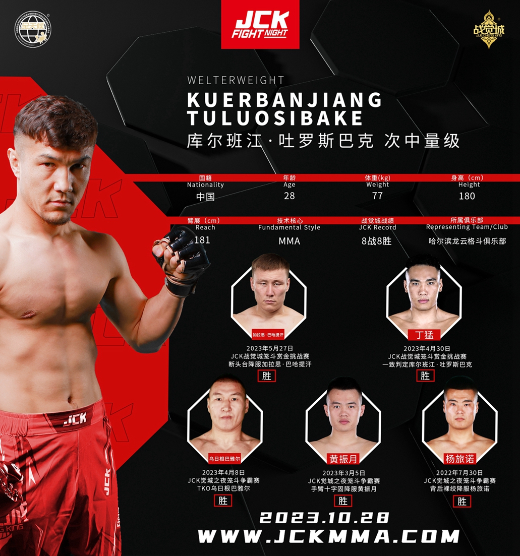 库尔班江,JCK战觉城次中量级官方排名第一,他还是JCK战觉城2020赛季“赏金霸主”,在JCK战觉城8战8胜,未尝败绩,2022-2023赛季,拿到4场终结,1场判定。不久之前他在2023年亚洲综合格斗锦标赛中收获一枚银牌。