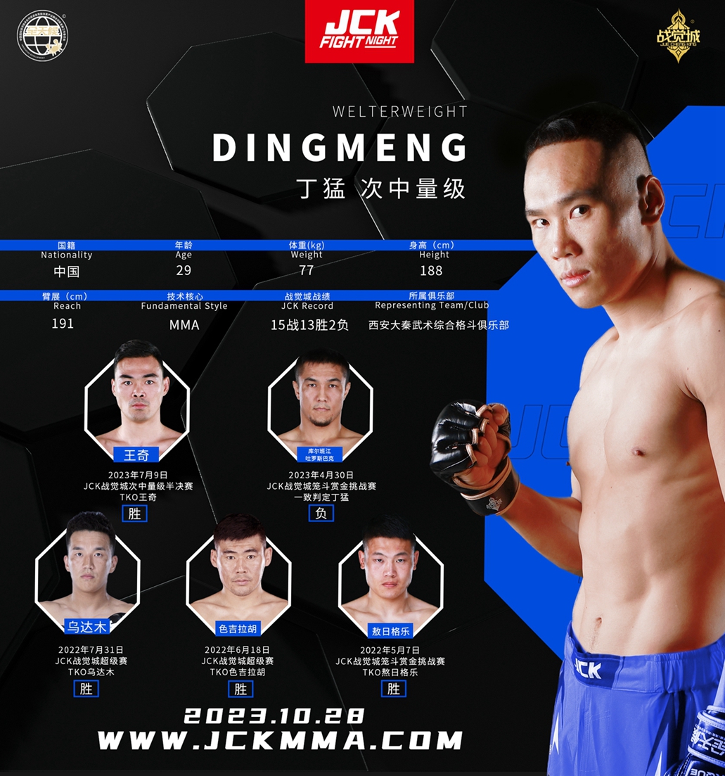 丁猛,JCK战觉城次中量级官方排名第二, JCK战觉城2022-2023赛季拿到3场胜利,均是TKO取胜,目前在JCK战觉城15战13胜,两场败绩均被库尔班江所赐。