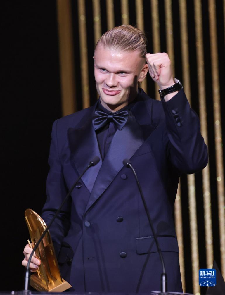 10月30日,挪威球员哈兰德获颁象征最佳前锋的盖德穆勒奖。新华社记者 高静 摄