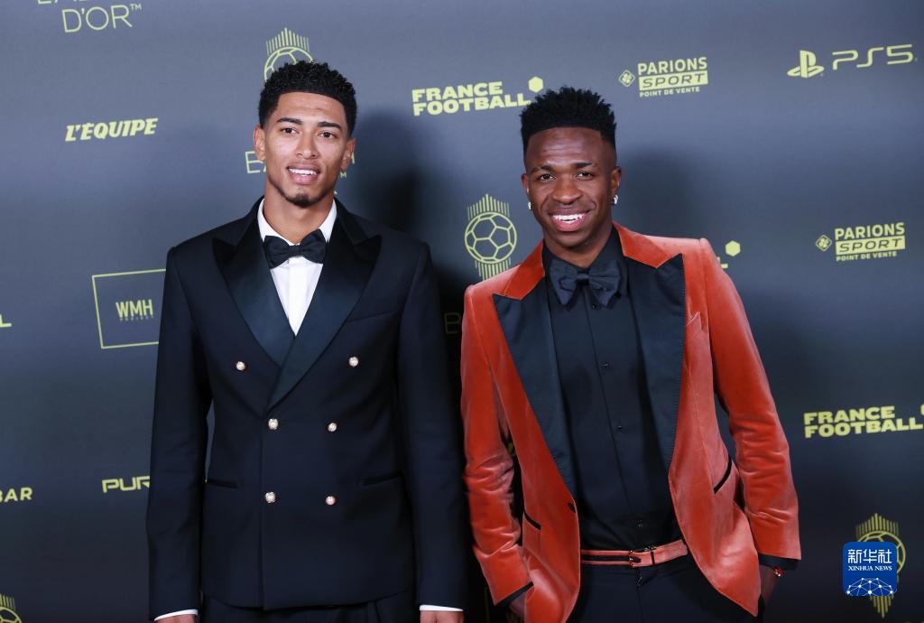 10月30日,英格兰球员贝林厄姆(左)与巴西球员维尼修斯出席颁奖典礼。新华社记者 高静 摄
