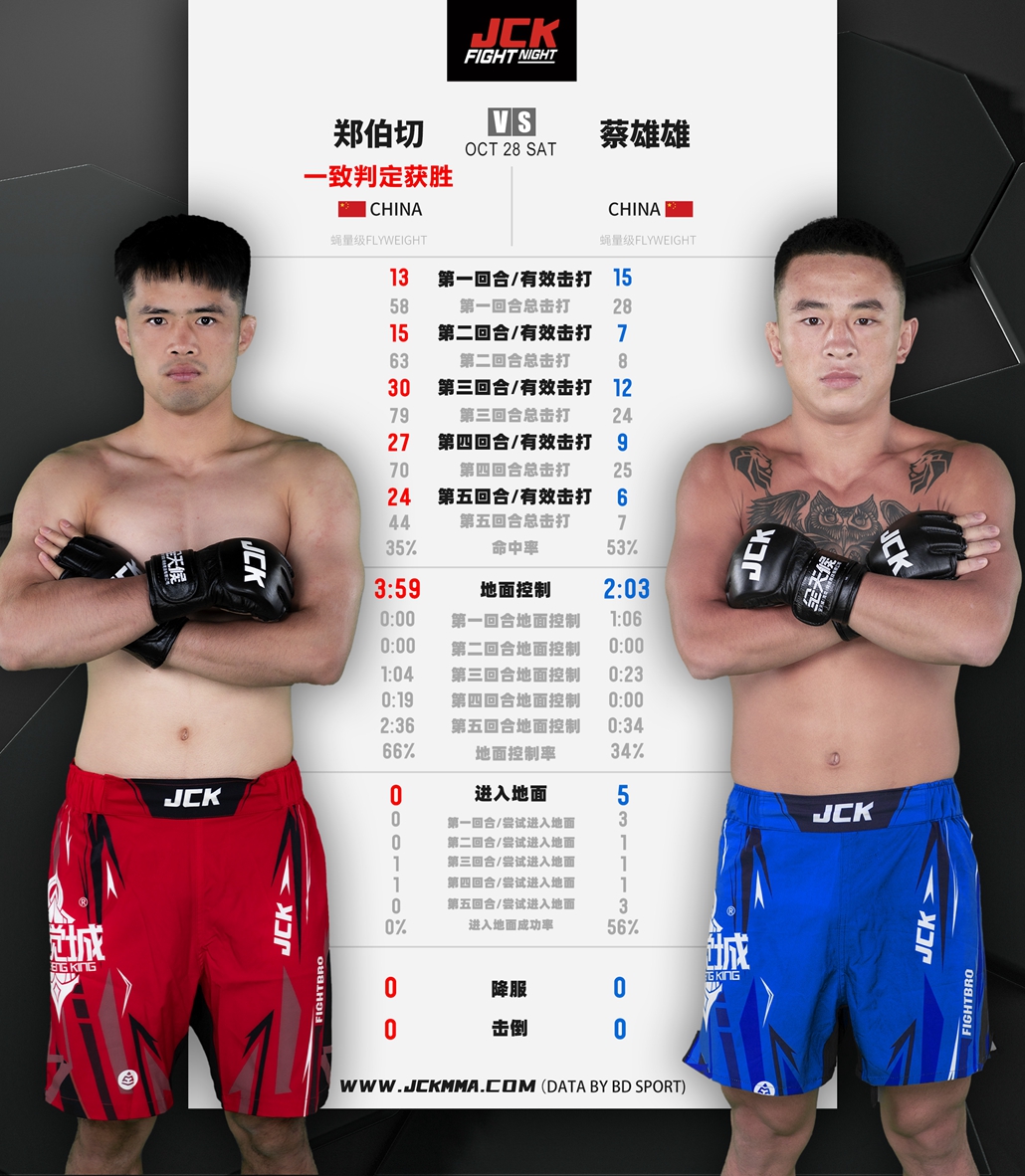 整场比赛过程中,双方都有抱摔尝试,让粉丝惊喜的是,站立系高手郑伯切在地面技术上的出色表现,他居然在第三回合和第五回合上演了尤为精彩的上位压制时间,第五回合最后的砸拳时刻也非常的凶猛,最终他一致判定战胜对手,拿到蝇量级金腰带挑战权。