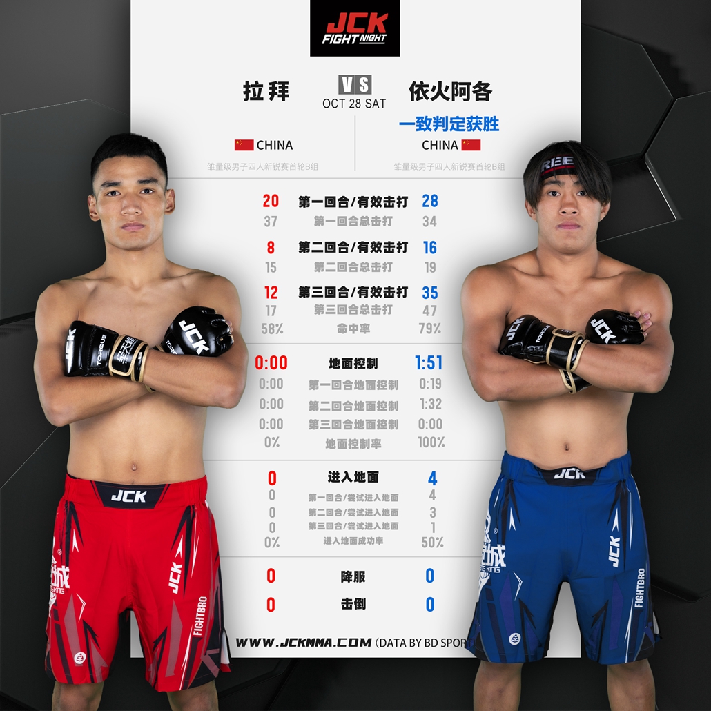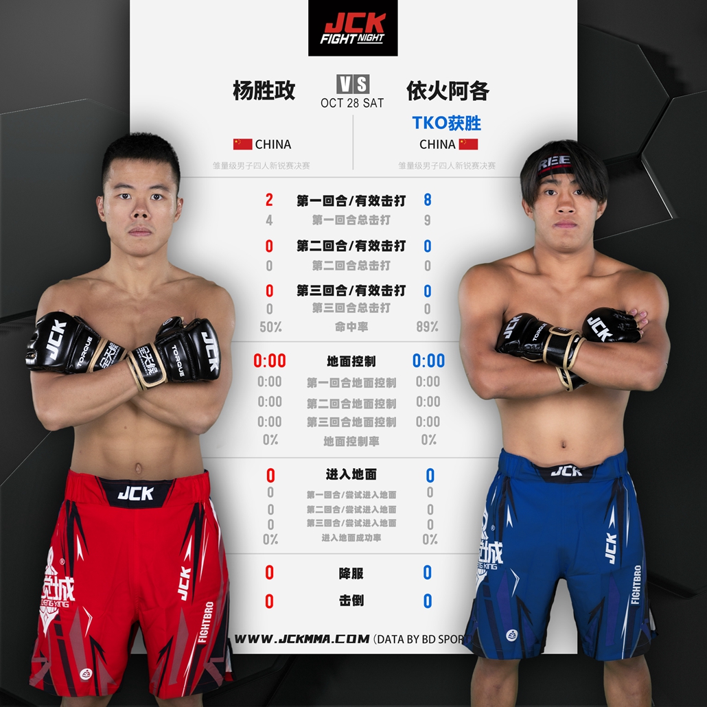 男子四人新锐赛首轮对决,依火阿各与杨胜政战胜各自对手晋级决赛。决赛当中,依火阿各再现李小龙绝技,一记突然的上步侧踹在第一回合TKO对手取胜,拿下冠军的同时获得JCK战觉城签约合同。