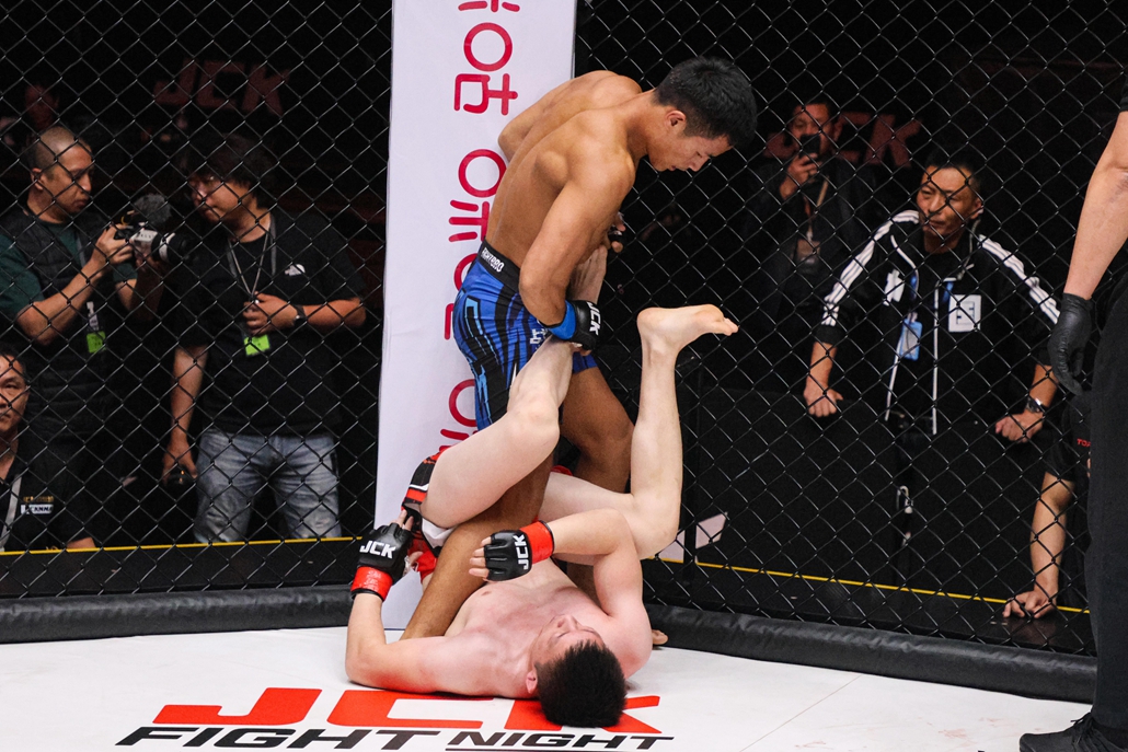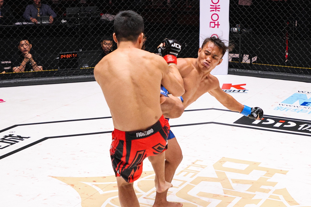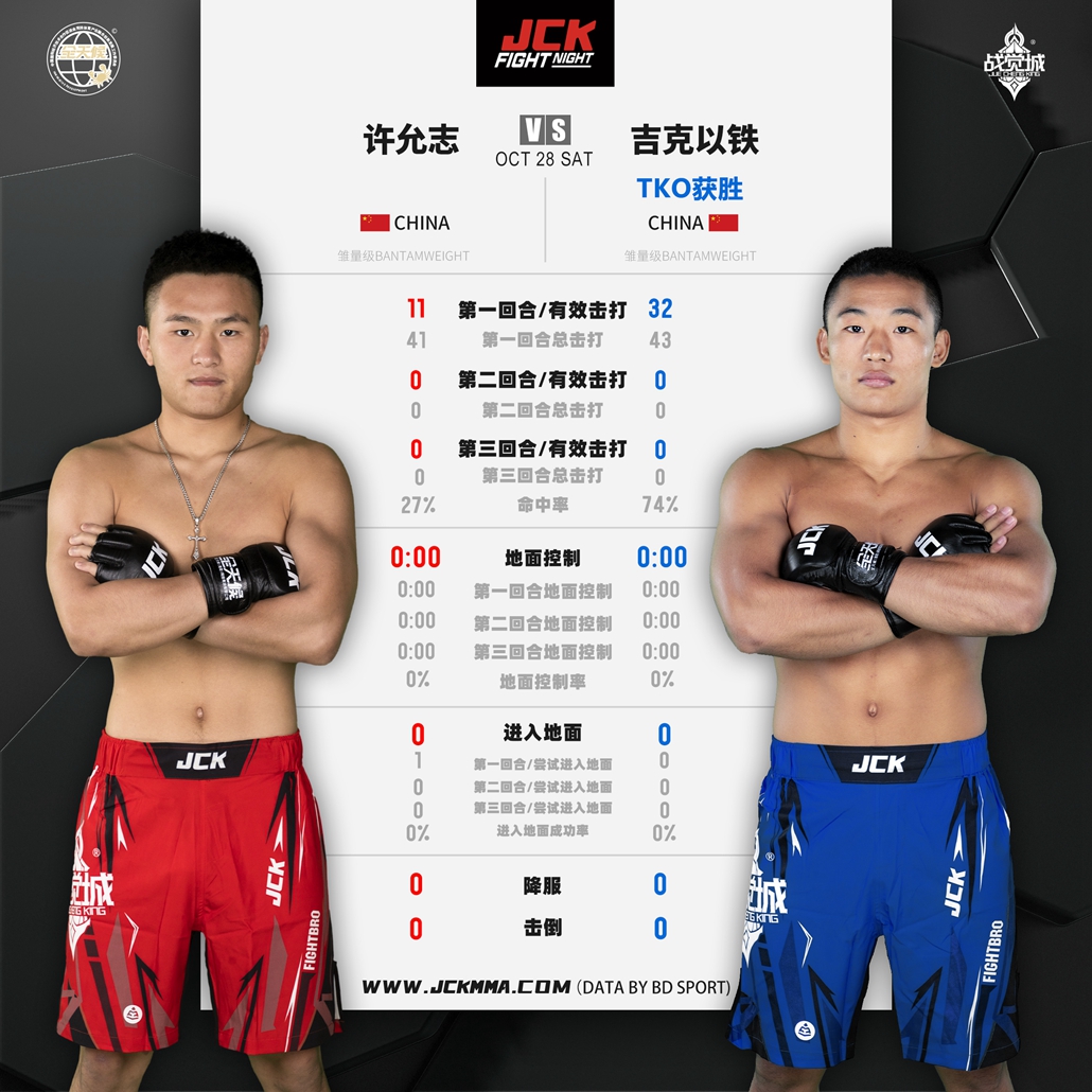 “疯狂的小黑”吉克以铁迎来JCK战觉城首秀,对阵实力选手许允志。比赛一开始,双方进行简单试探后,许允志试图抱摔吉克以铁,但被吉克以铁成功防御。在站立对拼上,吉克以铁的前手摆拳予以对手痛击,不断的击头与击腹让许允志难以招架,一套上下结合的精准连击,最终击溃许允志,TKO获胜。