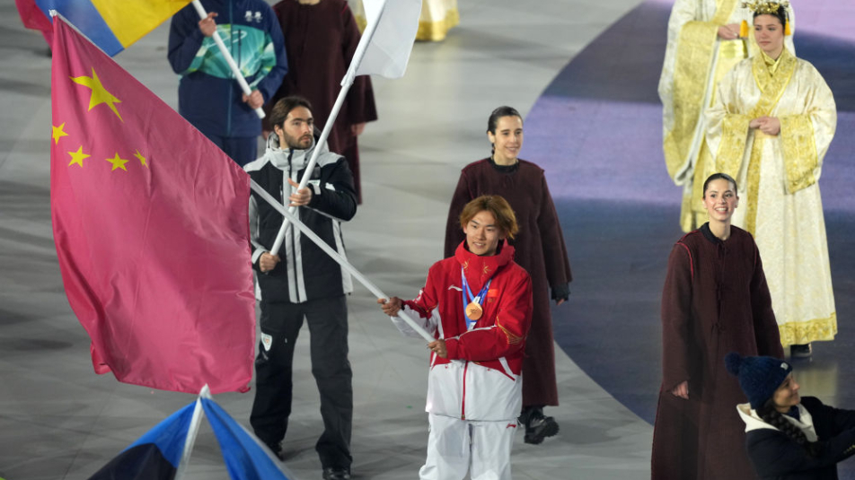 高清大图丨骄傲!冬奥会闭幕式上苏翊鸣高举五星红旗入场