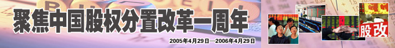 | 去年5月,4家上市公司率先进行股改。迄今为止,在近一年的时间里,已有768家上市公司完成或进入了股改程序,占总市值的63.5%,成为真正实现同股同权的全流通公司。 | 7月3日,沪深两市35家公司进入第39批股改名单,两市股改公司已达1093家 06.6.26 股改第38批名单 06.6.19 股改第37批名单 06.6.12 股改第36批名单 06.6.05 股改第35批名单 06.5.29 股改第34批名单 06.5.22 股改第33批名单 ...... |