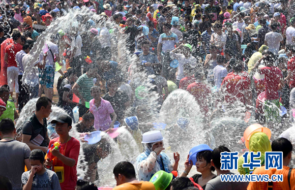 云南省西双版纳傣族自治州澜沧江畔,游客和当地群众在街头泼水狂欢,庆祝傣历1377年新年(2015年4月15日摄)。 新华社记者 杨宗友 摄