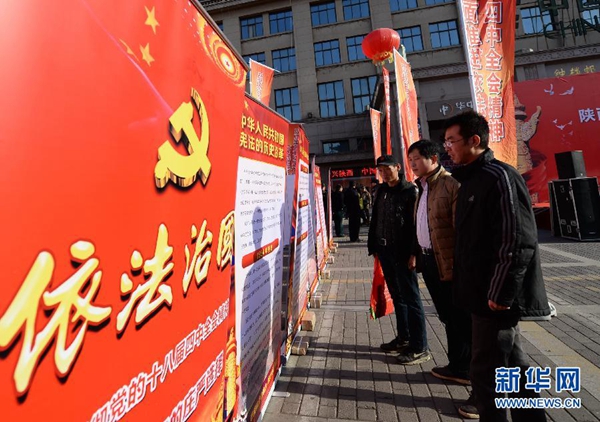 2014年12月4日,西安市民在宪法日宣传活动现场观看依法治国宣传展板。