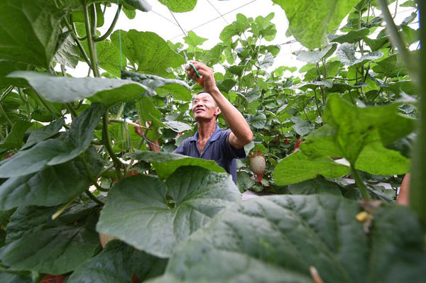 9月10日,宁化县石壁镇杨边村贫困户杨尤炳在福建石壁现代农业有限公司“两带一扶”哈密瓜种植基地里劳作。近年来,福建省宁化县依托宁化客家小吃、特色种养业等优势实施产业扶贫,开展创业就业培训、干部结对帮扶等推进精准扶贫,扶持贫困户发展生产或优先安排就业,促进贫困户增收脱贫。新华社记者 林善传 摄