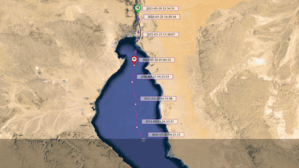 3月29日:早上9时30分,苏伊士运河管理局宣布“长赐号”已开始漂浮。该船的方向转至“正确航向”的80%,船尾从岸边移动了102米。