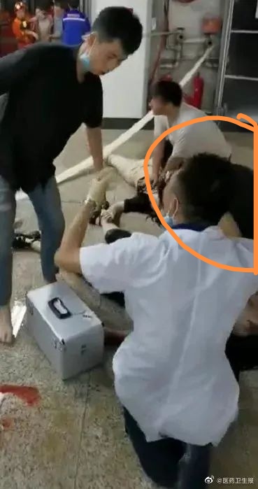 而图中画圈中的人是一名医护人员,在晕倒被于逸飞救醒了以后,继续加入了救治队伍,她就是郑州大学第一附属医院老年医学部的秦杰林医生。
