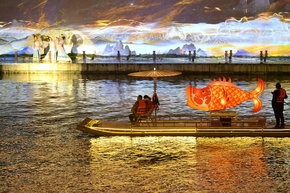 游客乘坐竹筏在湖北省宣恩县贡水河上观看河岸实景歌舞表演(2024年2月20日摄)。春节期间,当地组织丰富多彩的文化活动,吸引大批游客前来赏景游玩,为山乡经济注入活动。新华社发(宋文 摄)