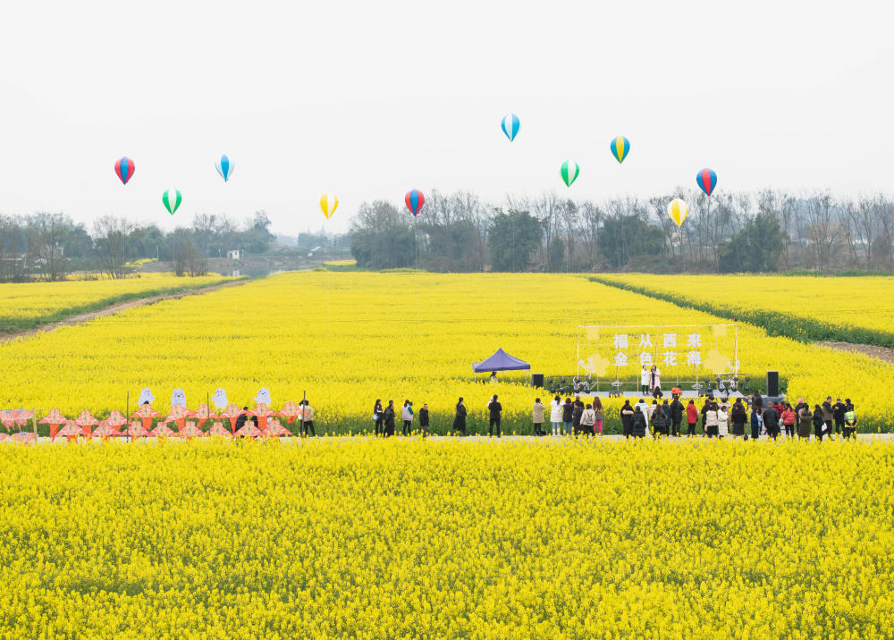 在四川省成都市蒲江县西来镇敦厚社区,游客徜徉在油菜花海里(2024年3月8日摄,无人机照片)。新华社记者 江宏景 摄