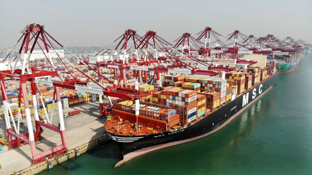 货轮在山东港口青岛港装卸集装箱(2024年3月13日摄,无人机照片)。新华社记者 李紫恒 摄