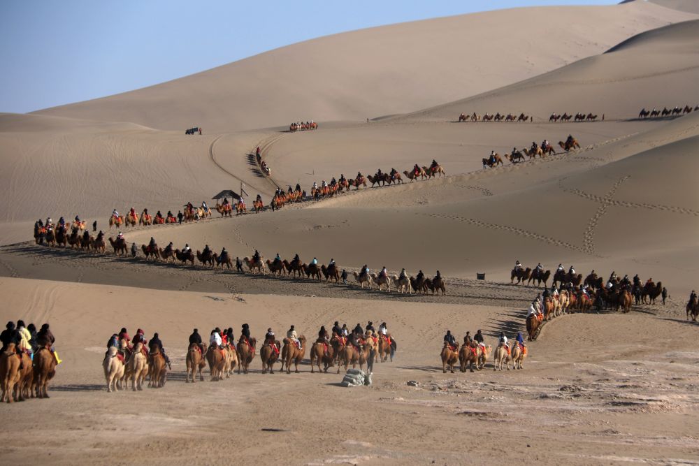 2024年春节迎来“8+1”假期,民众出游热情高涨,各地景区景点迎来参观热潮,文旅市场实现“开门红”。这是游客在甘肃省敦煌市鸣沙山月牙泉景区游览(2024年2月14日摄)。新华社发(张晓亮 摄)