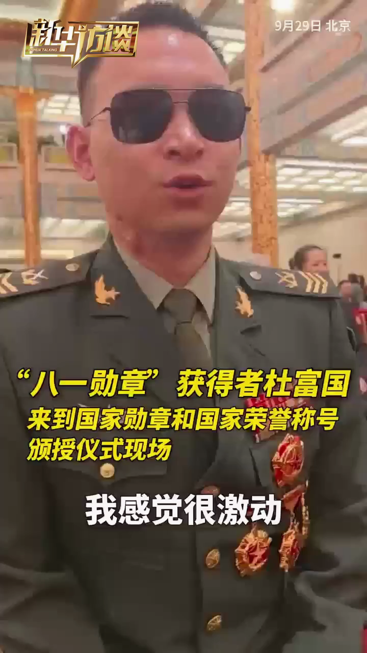 在国家勋章和国家荣誉称号颁授仪式现场,“八一勋章”获得者杜富国接受新华访谈独家采访时说:“今天能来现场感到很激动很自豪。”他说,感到祖国越来越强大,越来越繁荣。祝福我们的中华民族越来越繁荣昌盛!