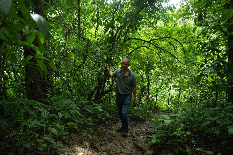 郭贤明介绍野生亚洲象的生活环境。新华网发(徐华陵 摄)