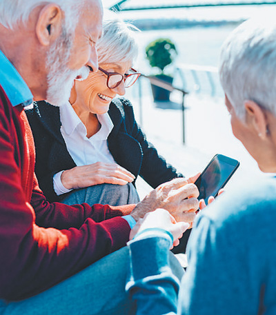 塞尔维亚三位老人在户外交流学习使用智能手机经验。