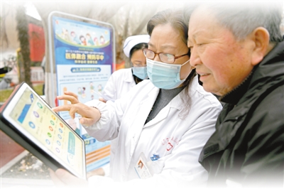 2020年12月2日,安徽理工大学第一附属医院医护人员走进淮南市田家庵区洞山社区,指导老年患者使用皖事通平台淮南分站上线的该院互联网医院应用服务,方便老年患者使用手机就医问诊。陈 彬摄(影像中国)